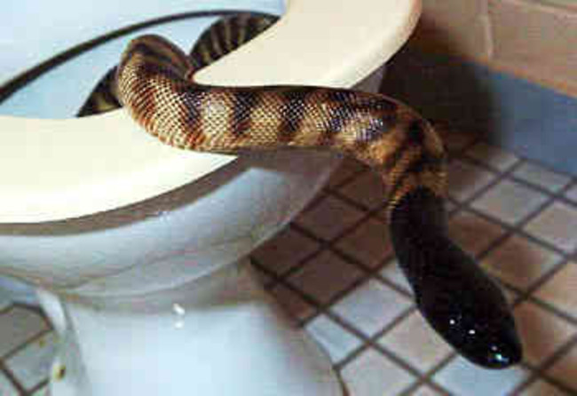 Una delle più temute e diffuse leggende metropolitane narra di lunghi e spaventosi serpenti che fuoriescono dai water. A dar veridicità alla storia, nel novembre 1998, ci pensò un’impiegata di Reading, Debbie Smart, che trovò realmente nella tazza del bagno dell’ufficio un pitone africano di un metro e mezzo. Pensava ad uno scherzo, invece l’animale si mosse realmente. Non fu mai chiaro come ci fosse arrivato.